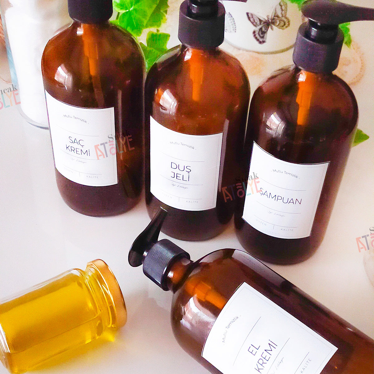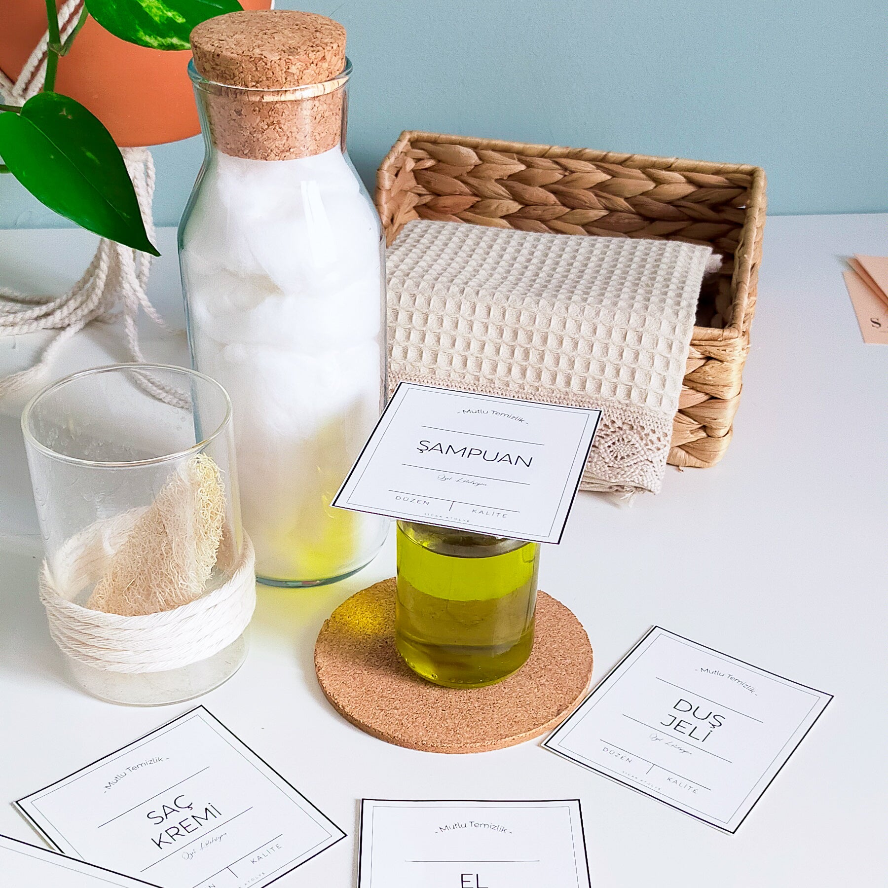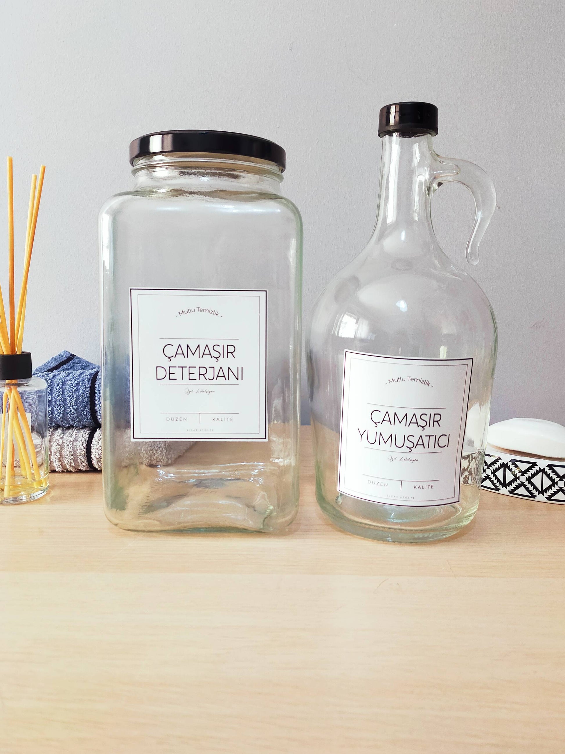 Artık şişe ve kavanozlarınız birbirine karışmayacak! Özel tasarlanmış deterjan etiketlerimiz sayesinde banyonuzda derli toplu, estetik ve modern bir görünüm oluşturabilirsiniz. Üstelik sade ve şık tasarımlarıyla banyonuzdaki dekorasyona uyum sağlar.