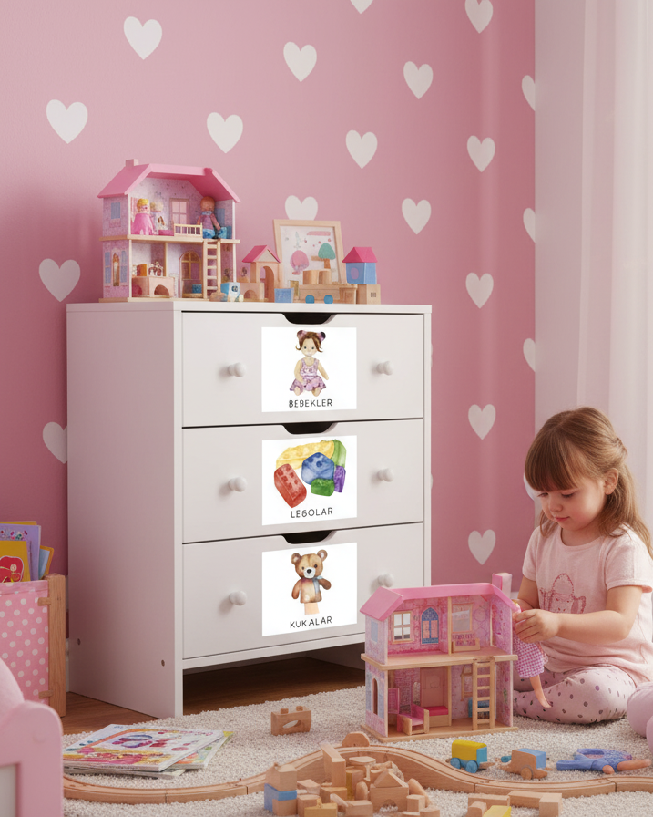 ✅ Çocuk Odasında Düzeni Sağlar – Boyalar, bloklar, arabalar ve bebek kıyafetleri için özel tasarlanan etiketlerle eşyalarınızı kolayca kategorize edin. Oyuncaklar için belirlenen özel alanlar sayesinde odada gereksiz karmaşanın önüne geçin.