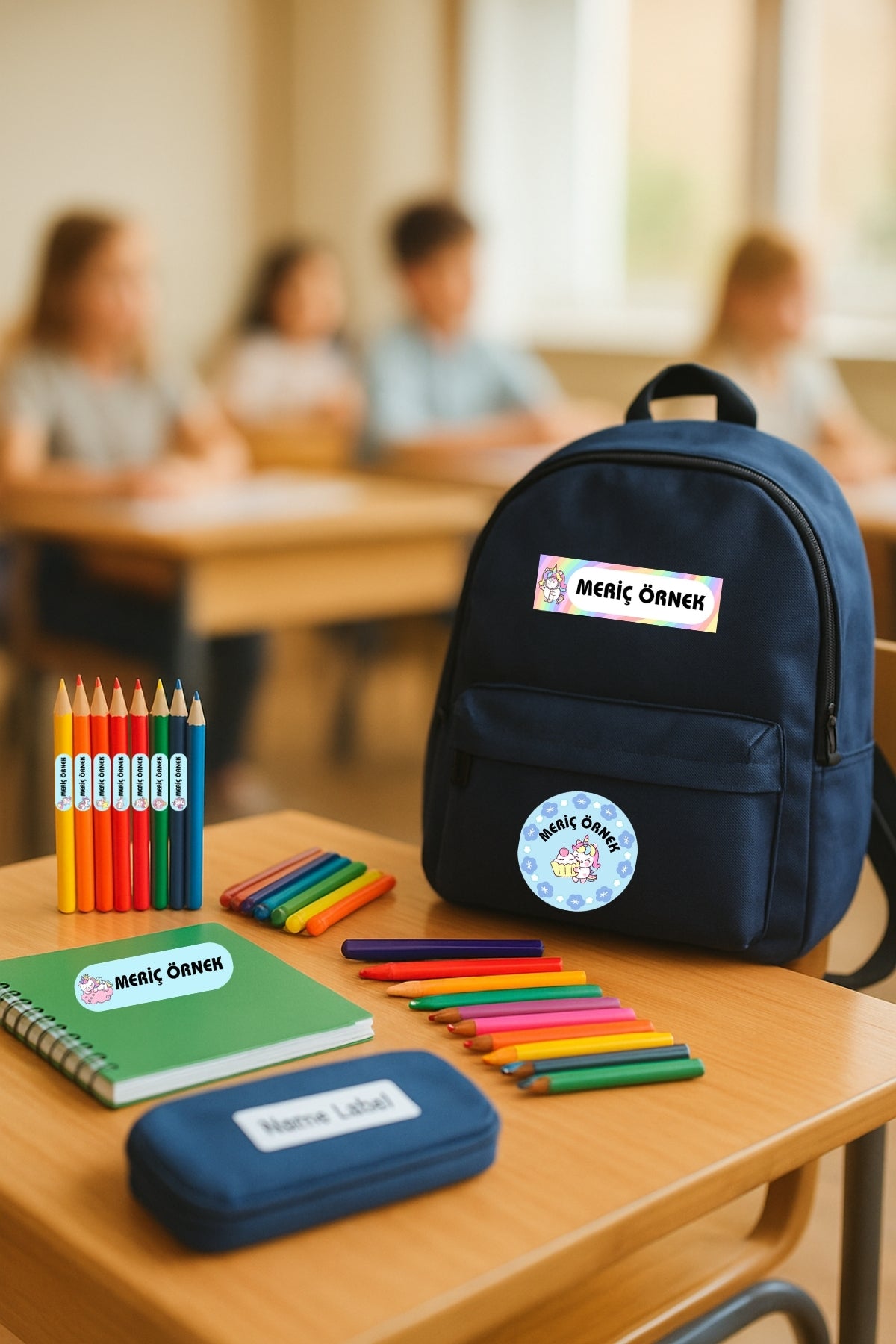 Sudan etkilenmeyen ve uzun süre yapışkanlığını koruyan bu etiketler, okul döneminde ebeveynlerin en büyük yardımcısıdır. Çocuğunuzun isminin yer aldığı sevimli görseller sayesinde hem eşyalar güvence altına alınır hem de çocuklar kendi eşyalarını severek kullanır.